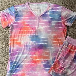 Charming tie-dye pajama set with pink and purple hues. Soft and cozy for a restful sleep. Only worn once. In excellent condition!