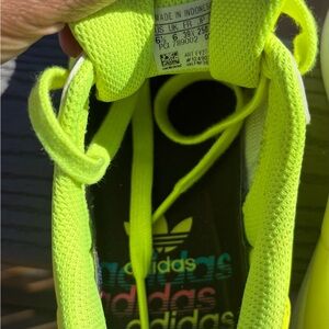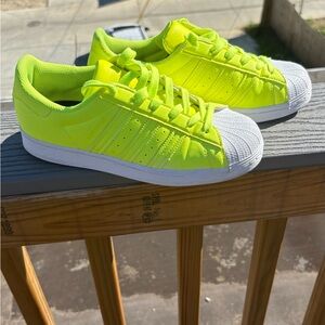 Vibrant lime green Adidas sneakers with classic white toe cap. Perfect for a bold look. Used gently worn, great condition