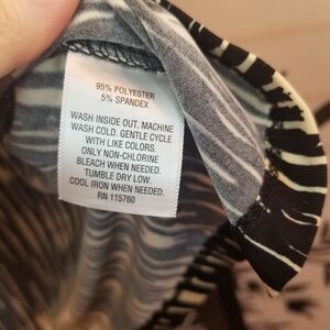 95% Polyester 5% Spandex. Approximately 17 inches pit to pit and 24.5 inches in length. Very stretchy! NWT. Comes with extra buttons. Wash first since this was given from a friend who smokes. I did steam and sanitize.