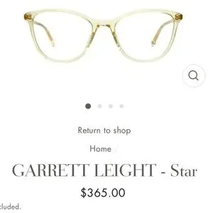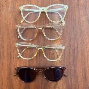 Set of four stylish glasses in various colors. Includes three clear frames. The sunglasses and pink pair have been SOLD All the eyeglasses have a prescription in something else that would need to be swapped out with your prescription or a pair of tinted lenses. Also for sale is a sunglasses clip also from Garrett Leight as seen in the last few pics that fit on Star and Magician. Non prescription clip. I loved this design so much. I bought almost every color way they made. Can sell all of them for a discounted price or individually. Priced at $40 per pair.
