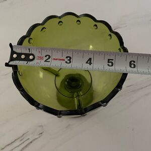Stunning dark green glass with a bowl that has scallop details on the edge and embossed teardrop accents. It is like a piece of art when displayed. You can also use it for candy, as a catchall for keys or to serve out of.
