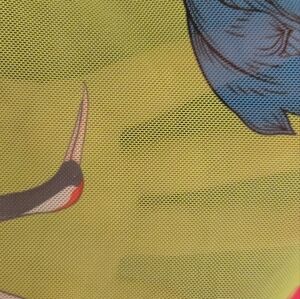 Vibrant scarf with a mix of colors and patterns. Features floral and bird designs.