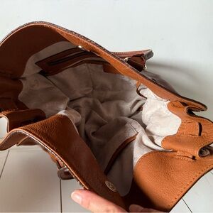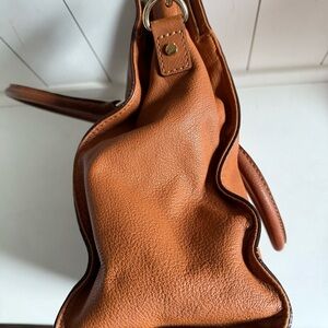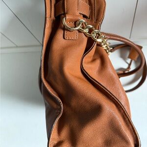 Elegant brown leather tote bag with gold accents. Perfect for everyday use. Minor wear from gold MK lock & slight stain shown in last image.