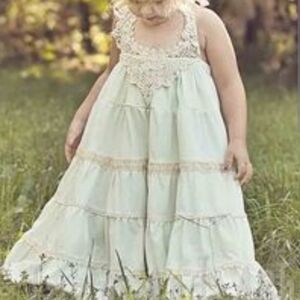 Charming kids dress with lace details. Soft cream fabric. Ideal for casual outings.
