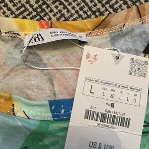 ZARA - Sz Large (NWT) Women’s bold artistic print with vibrant colors. Features diverse figures in dynamic poses. Perfect for a unique style statement.