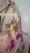 This is absolutely beautiful and so feminine and adorable. It’s so many different fabrics and textures on this doll and the swing has two levels and it is a thick, nice heavy acrylic but not too heavy to hang. The ribbon is light, pink and green and the same color of the beads. I found it in the closet not sure how old it is, but I know it’s at least 15 years old.