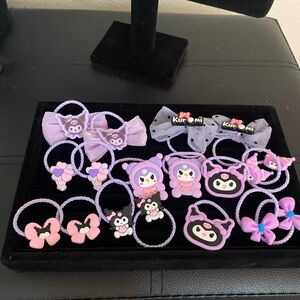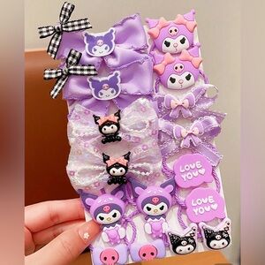 Adorable Kuromi purple hair accessories featuring bows and cartoon characters. Perfect for adding a playful touch to any hairstyle.