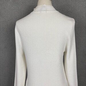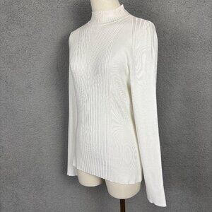 Add this beautiful Ribbed Mock Neck Sweater to your wardrobe. This is perfect for business casual or a night out on the town. It is white and is sized in large. It is constructed of Rayon and Nylon. This is New Without Tag's.