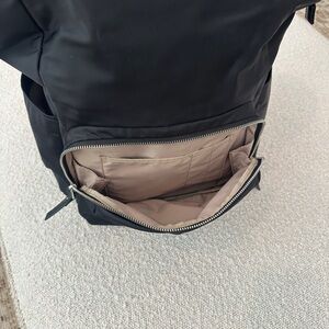 Great TUMI quality women’s backpack with a shape that stands on its own and holds a ton of items! Computer/tech pocket inside. Side pockets and sleeve for sliding it on suitcase handle for luggage travel.