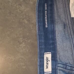 Free People x Wrangler Exaggerated Boot Jeans. Size 29. More measurements are listed below. 80% Cotton 18% Polyester 2% Cotton. Made in China. There are minor signs of wear on the thighs (please view photos #9-10). In great condition.