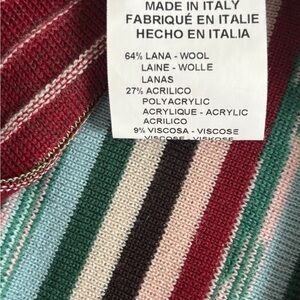 Elegant multicolored classic Missoni knit with green, pink, blue and red stripes. Comes with self belt so there are a number of ways to wear this dress. V neck and 3 buttons. Crafted in Italy by Missoni.