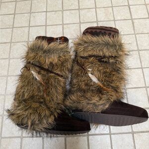 Cozy, warm faux fur Muk Luks indoor boot slippers with brown suede. Knitted detail.