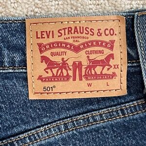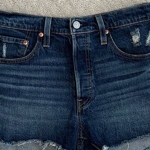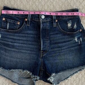 Levi's 501 Button Fly High-Rise Stretch Denim Shorts - Blue - Size 28 - Distressed/Classic. These classic Original Fit Levi's 501 shorts feature 99% cotton and 1% elastane for a comfortable fit, signature button fly, five-pocket styling, high-rise waist, fitted through the hip, raw frayed hem, light distressing, and belt loops. Excellent pre-owned condition!