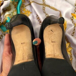Chic black heels with a sleek design! These were my go to pumps so they’re well loved but are made of a fantastic soft leather! They have been to the cobblers but the work done was a bit sloppy - could certainly use another visit. Shoes definitely have some wear / flaws so please see photos prior to purchase. They’re a 39.5 which is about a US 9/9.5 for this brand.