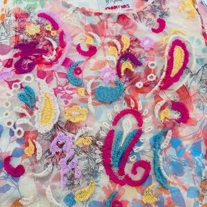 The Leafy Mazzy Flared Tank is a light and airy piece adorned with bold, colorful placement embroidery. It features a rounded neckline and is lined for added comfort. The sleeveless design includes godets at the sides, creating a flowing bodice and an asymmetrical hemline. Style it with casual linen shorts and fashionable sneakers for a fresh and relaxed look.