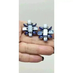 Super fun pair of retro vintage earrings from the 1950s made in Japan. These are moonglow or cat's Eye blue plastic beads it's accented with flat round beads that are half blue half pale blue. Scented with silver filigree discs and tiny silver beads. Is all handwired. A couple of beads are missing a spot of coating Beads can be turned so that the missing coating edges are to the inside of the earring it cannot be seen.