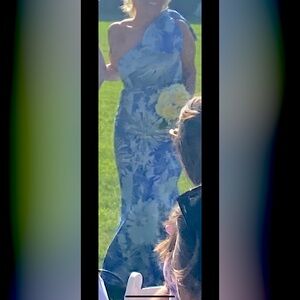 Chic one shoulder design with floral print. Features a stylish bow accent. Ideal for special events. It had been hemmed to fit 5’3 with 2 inch heel