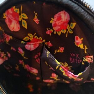 Chic floral Betsey Johnson backpack bag. Zipper top, inside zip pocket and two inside fabric pockets. Straps adjust out to 30" and also a carry handle on top. Pretty rose print fabric lining. Perfect condition.Just so cute!!☺️