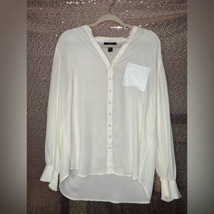Chic ribbed design with a cozy button up neck. Also featuring a hood. Size Large. Fits oversized. Perfect for layering and fall time with a bralette.
