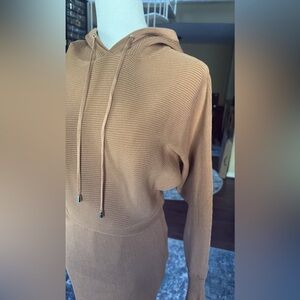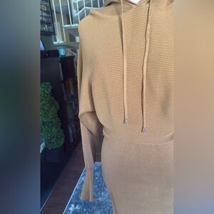 Stylish tan hooded knit dress with long sleeves. Perfect for casual outings.