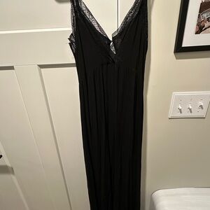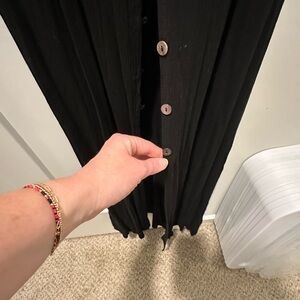 Elegant black maxi dress. Features lace trim and button-down front. Perfect for evening wear. Buttons on the front go down below the knees and the rest flows open.
