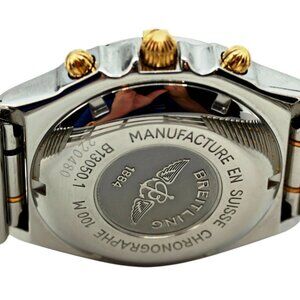 Breitling 39mm Men's Chronomat Two Tone Automatic Bullet Band Watch Item Description Hello! Thank you for taking the time to view my listing. For sale here is an excellent watch, all the information you need in regards to the watch is listed below. If you have additional question, please feel to reach out. For my repeat customers, you may notice that my description looks a little bit different. I have modified the formatting to make it more simple and concise for my customers. Brand: Breitling Model: Chronomat Reference/ model number: B13050.1 Band reference: N/A Serial number: 220480 Circa: 1990's Movement: Swiss made automatic movement Service/ battery: Last service is unknown, watch has been inspected by a watchmaker who determined that it did not need to be serviced at this time Functionality: Watch has been tested and all functions are working flawlessly including the time, date, and chronograph, all chronograph hands properly reset to the 12:00 position as they should, and the watch is keeping excellent time Case size: 39mm stainless steel and 18k yellow gold case Lug/ band size: Original stainless steel bracelet band that connects to the watches 20mm lugs and then tapers from 24mm to 21mm near the buckle, missing a few removable links, currently sized for a 6.5 inch wrist; it is quite rare to find this watch with an original bullet style bracelet like this Features: White dial, rotating bezel, Swiss made automatic movement, analog display, luminous hand