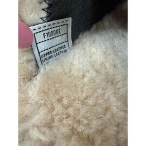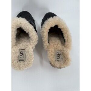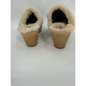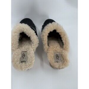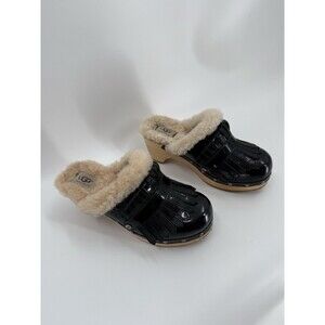 The UGG Black Patent Leather Kiltie Clog with Detachable Fringe in size 7 is a stylish and comfortable pair of women's shoes perfect for casual and travel occasions. Made with a round toe shape, slip-on closure, and a mid heel height, these clogs feature a shearling fabric lining and sheepskin insole for added comfort. The patent leather upper, rubber outsole, and wedge heel style make them durable and trendy, while the detachable fringe adds a unique touch to the design. As part of the UGG Classic product line, these clogs embody both fashion and functionality.