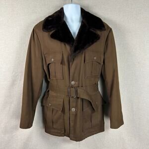 Vintage Shanhouse Mens Canvas Barn Coat Size 44 Chore Jacket Faux Fur Lined Belt