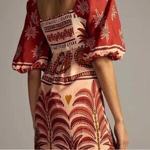 FARM RIO Square Neck Dress Puff Sleeve Linen Dress Size Small