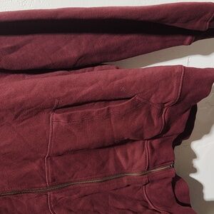 Stylish burgundy zip-up hoodie with front pockets and drawstring hood.