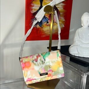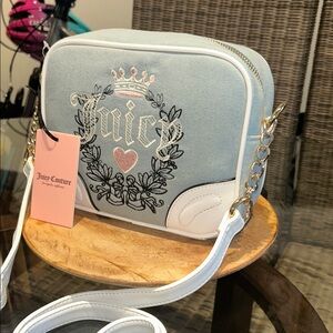 Elegant light washed denim heritage crossbody with Juicy Couture logo. Features chain strap and heart detail with gold heart purse hang tag.