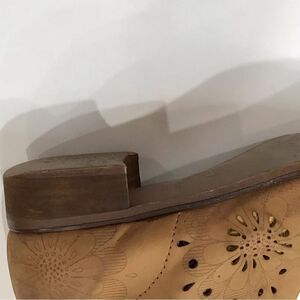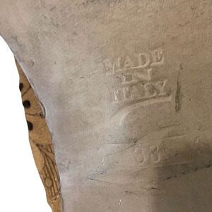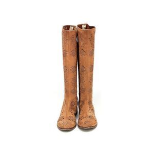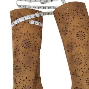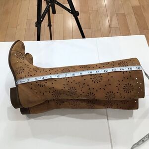 Beautiful floral cut out tan suede bohemian style boot made in Italy. These are in good pre owned condition with a distressed / weathered look. There is some minor wear: tiny white spot on one boot, inside the boots the white fabric strips are detached from seams but seams and stitching are perfectly intact; some wear on heels. Otherwise boots are still beautiful. Size 38 EU, Size 7.5 US. These boots might fit a Size 8. See measurements for calf size, etc.