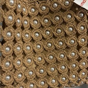 Stylish brown crochet tote bag featuring elegant pearl accents. Perfect for adding a touch of sophistication to any outfit.