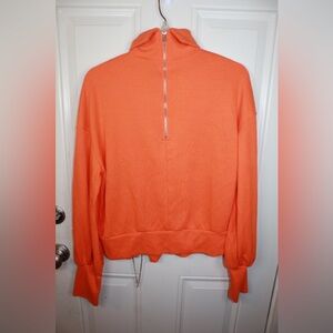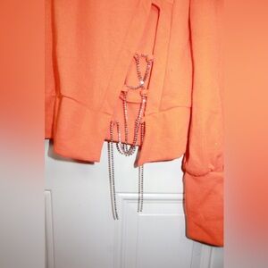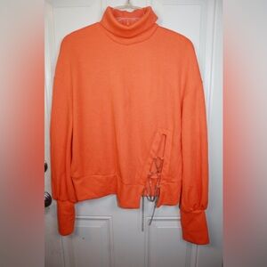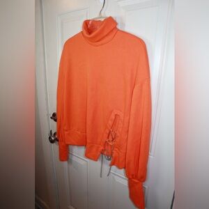 Bright orange turtleneck sweater. Features unique side chain detail. Cozy and stylish for any occasion.