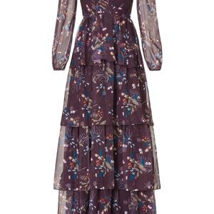 leena By Mac Duggal Dress Tiered Ruffle Maxi Gown in Plum Floral