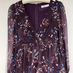 Purple floral chiffon, featuring a ruched surplice bodice with a plunging neckline and bishop sleeves. The seamed waist gives way to the multi-tiered skirt, completing this A-line formal gown.