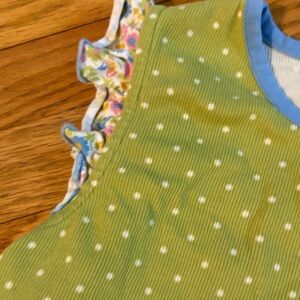 Charming green tank top with white polka dots. Features ruffled sleeves. Ideal for playful outings.