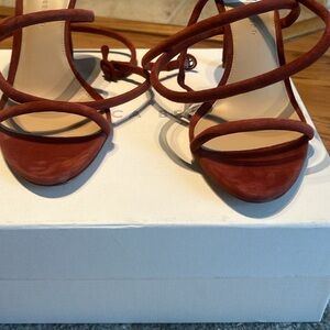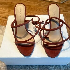 Tubular straps detail the vamp and instep of a contemporary sandal balanced by an almond toe and tapered heel.