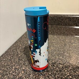 Vibrant Starbucks travel tumbler with playful graphics. Features a mix of blue, red, and white colors.