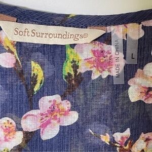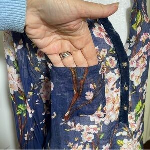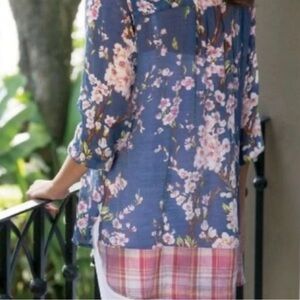 Soft Surroundings Adele Cherry Blossom Tunic Top V-Neck Long Sleeve Navy Blue. Semi-sheer, lightweight, tunic-length blouse in navy blue with a cherry blossom floral pattern in shades of pink, white, green, and yellow. V-neck opening over three-button velvet trim detail and matching buttons at sleeve cuffs. Single chest pocket. Slightly longer in back, the back has a darling contrasting pink and white plaid border at back hemline and gathered pleating between shoulder blades. Can be worn as is or with a tank or cami underneath. Cool, breathable rayon fabric is feather-light making it ideal for travel. Looks great paired with white or with jeans. A flattering, stylish addition to your wardrobe!