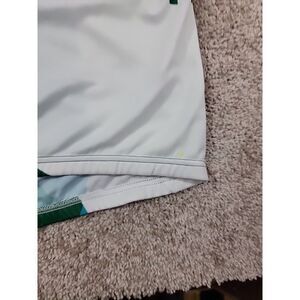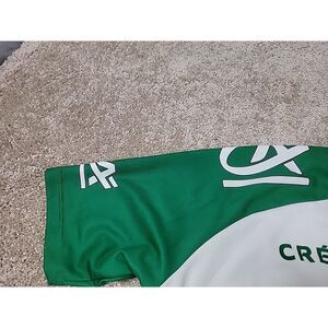 This vintage Credit Agricole cycling shirt features a unique 80s design with a terry cloth lining, making it a stylish and functional choice for cycling enthusiasts. The shirt has a short sleeve with a 1/4 zip closure for easy wear and a pop of color in green. It is a size 5 (medium) and is machine washable for convenience. Ideal for activewear during all seasons, this casual rugby shirt with zipper accents is perfect for cycling and embodies a nostalgic 80s theme.