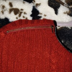 7th Avenue New York company, deep red sweater, XL. BLACK LEATHER LIKE COLLAR, AND THE END OF THE SLEEVES, GOLD ZIPPER ON THE LEFT SIDE OF THE NECK FOR EASY PULLOVER.