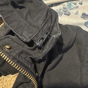 Stylish black vest with a cozy sherpa lining. Features a hood and front pockets. Perfect for layering. Hood zips on and off