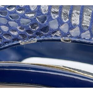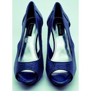 These White House Black Market Leather "Bluebell" heels feature a snakeskin pattern which is a combination of blue and black, a 4 inch heel, and cut outs on both sides of the heel. These are open toe and so much fun.