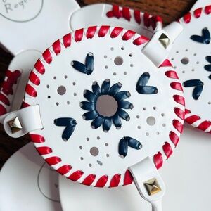 These Jack Rogers jelly sandals are a fun and vibrant addition to your wardrobe! Featuring a white base with blue & red leather whipstitch detailing and stud accents, these sandals are both stylish and comfortable.