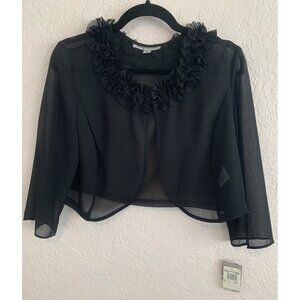 Has a gored flare skirt, Ruffle on the neckline of sheer jacket.