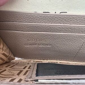 The Lodis beige wallet is a sophisticated accessory crafted from high-quality textured leather. Its elegant design features a zip-around closure and decorative stitching, making it both functional and stylish. Perfect for organizing your essentials with a touch of class. RFID protection- block hackers from reading your information. NWT