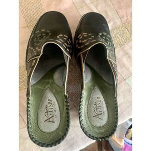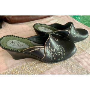 Rare Nice!CLARKS leather weave mules work walk wedge mule, size 8.5. Good condition.