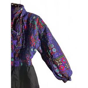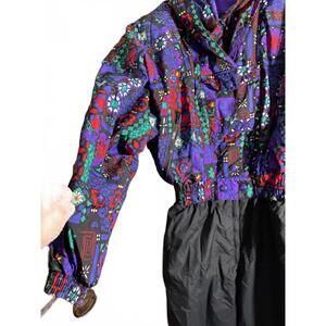 Get ready for winter with this eye-catching vintage snowsuit featuring a vibrant multi-colored pattern. Made with a cozy material, this snowsuit ensures warmth and style on the slopes or during outdoor fun. Its unique design showcases a colorful upper with intricate patterns and plain black pants. Key features include: - Hooded design for added protection - Stretchy cuffs and ankle openings - Elastic waistband for a comfortable fit - Perfect for skiing, snowboarding, or winter activities - A nostalgic piece that stands out in any collection