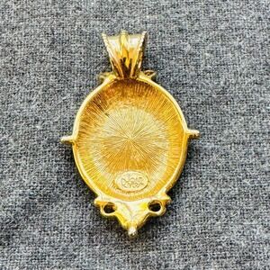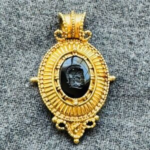 Stunning Joan Rivers pendant showcasing timeless elegance and sophisticated design. This striking piece features a detailed black cameo depicting a Roman soldier or warrior, set against a rich gold-tone backdrop. The pendant boasts an intricate ornate frame adding depth and character to the design. Ideal for a formal event, a sophisticated dinner, or as a unique statement piece for a special occasion.